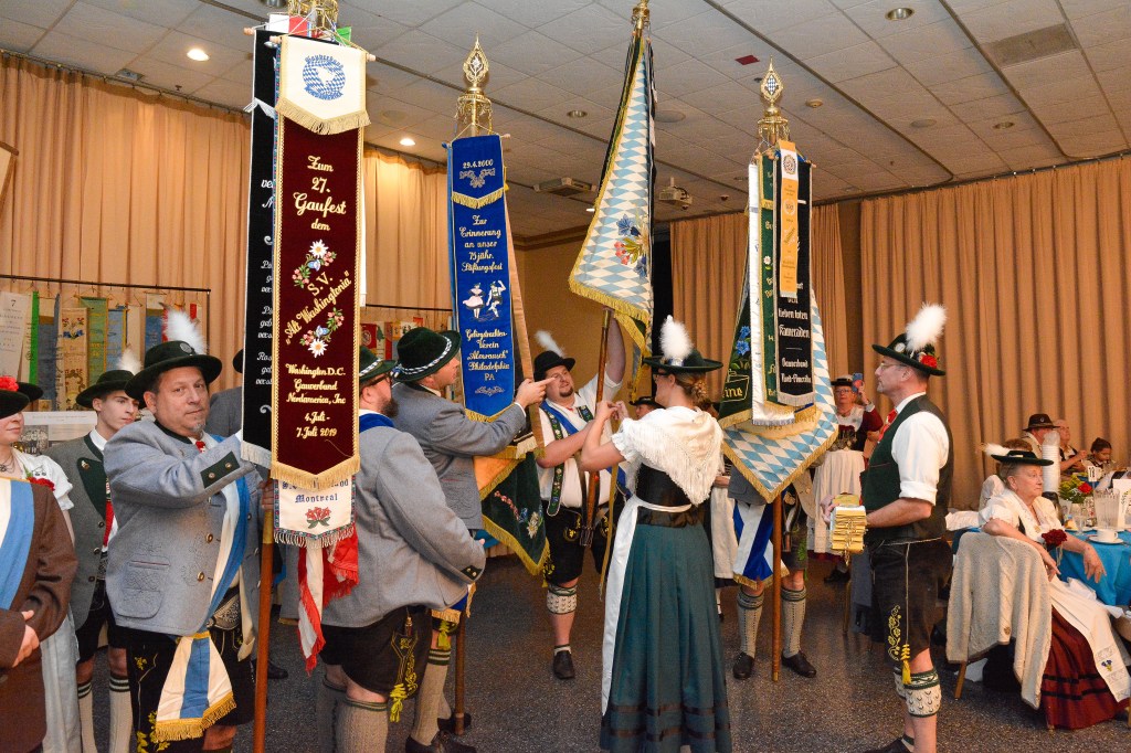 In 1963 S.u.G.T.V. Washingtonia celebrated its 40th Anniversary and commissioned a flag sewing firm in Munich, Germany to create this embroidered work of art. It depicts a dancing couple in front of the Capitol, along with the flags of the District of Columbia, the USA and Bavaria. We have proudly carried our flag at festival parades in the United States and Bavaria.